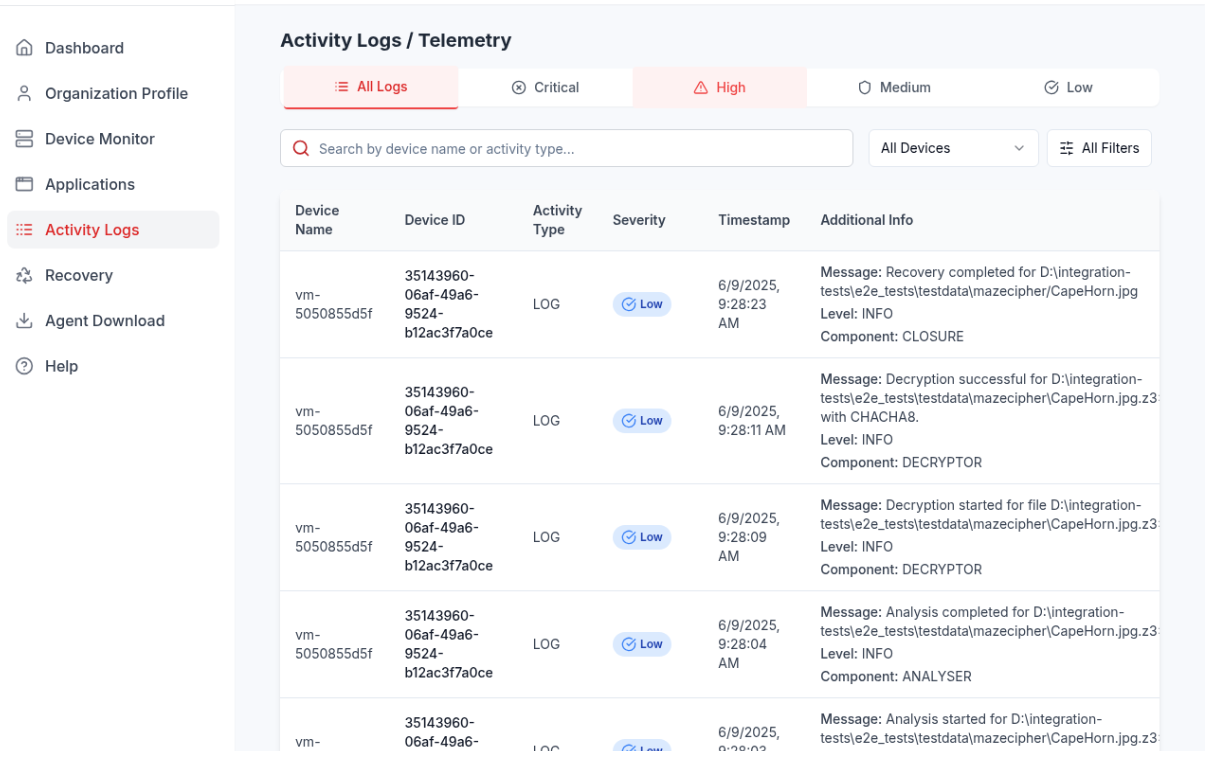 - Activity Logs: Ensure agents detect and log encryption/decryption events.